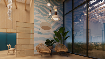 La propuesta busca reflejar un estilo bohemio con toques modernos y resaltar el color azul propio de la marca. Tambien utilizamos la vegetación para crear un espacio interior que conecte con la naturaleza.